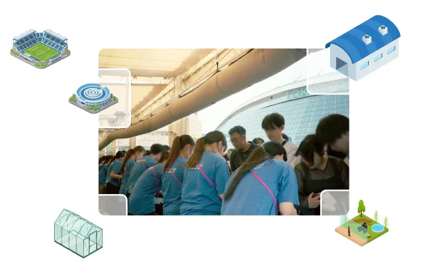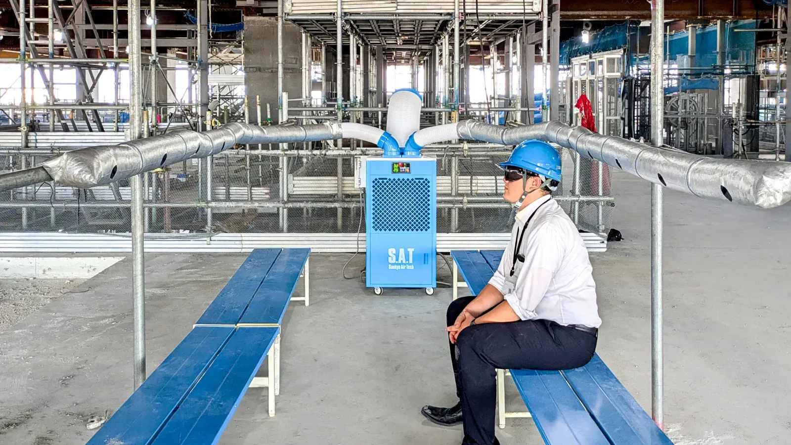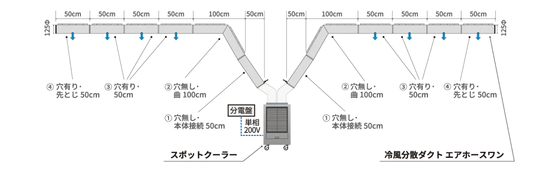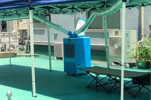冷風分散ダクト一体型スポットクーラーとは、ツインダクト式の強力な冷房能力をもったスポットクーラーに、冷風分散ダクト エアホースワンを接続することで、1台で同時に8~10人に冷風を届けることができるシステムです。
