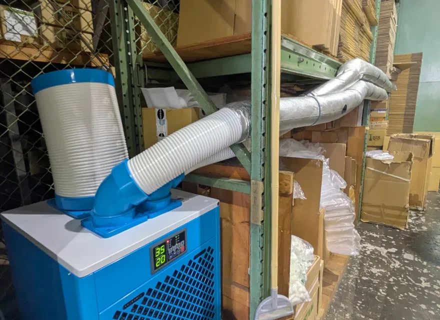 スポットクーラーや首振り扇風機などを使用していましたが、年々厳しくなる暑さへの対策と、検品時に強風で紙類が飛んでしまう問題を解決するため、冷風分散ダクトエアホースワンを導入することにしました。