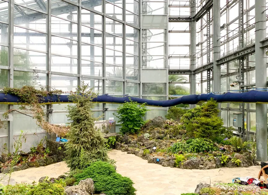 高山植物室内で生育には風に弱い植物もあり、各ゾーンに応じた風量や風速についてもお打ち合わせをさせていただきました。大型空調機は屋外に設置をし、空調機と接続したエアホースワンを全長40mに渡って設置し、穴あきダクトと穴なしダクトを使い分け、風の当たり具合を調整させていただきました。