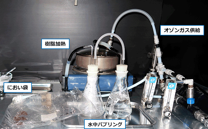 樹脂成型工程において発生する臭気の対策について、 当社のアクアオゾンによる脱臭効果を評価する。