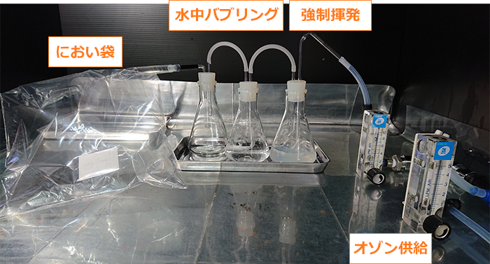 処理設備の排水を三角フラスコに入れ空気を吹き込むことにより、臭気成分を強制揮発させる。