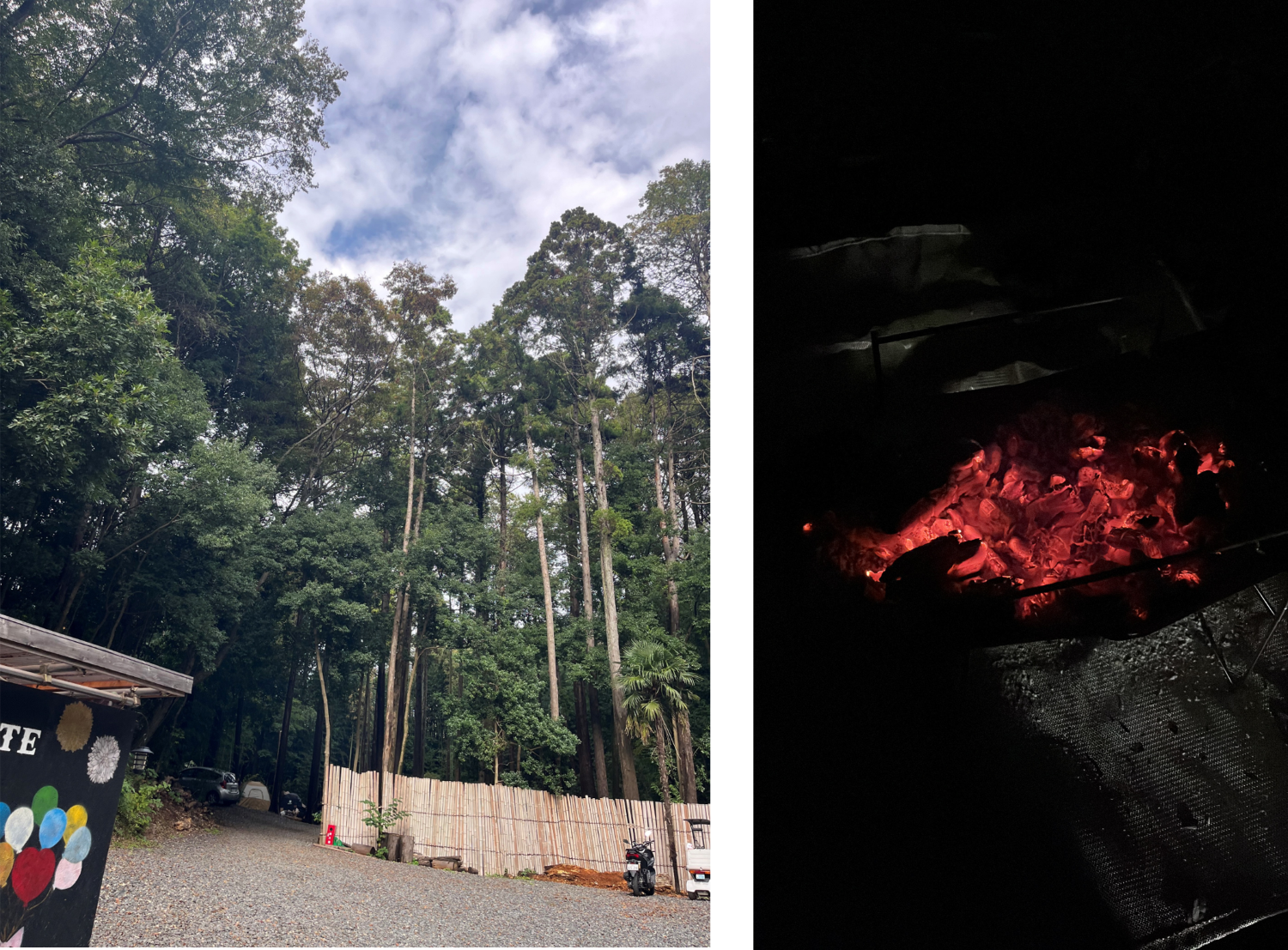 それでも時間帯や風向きによっては、周囲の焚火や料理のにおいがふわっと流れてくることがありました。
